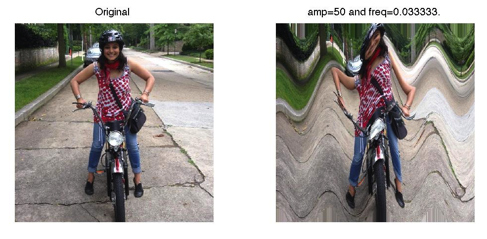- Create a function waveLast.m that takes as inputs img, amp, freq and outputs the waveImg image that produces a wave in your picture. The wave can be created by allowing